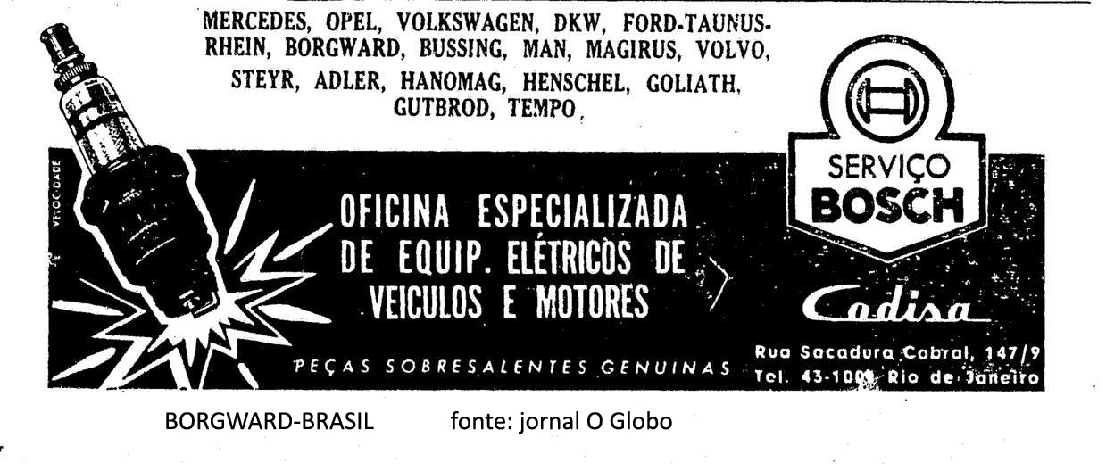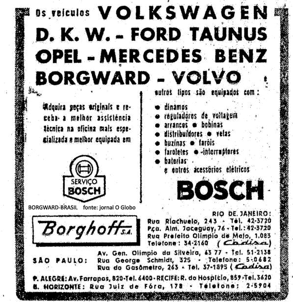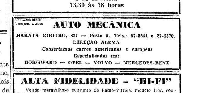 Aqui nesta parte temos, como exemplo, uma pequena série de anúncios publicados nos principais jornais da época, de prestadores de serviços e locais que forneciam peças originais para os Borgward, desde a pequena oficina até grandes empresas do ramo com nomes que ficaram na nossa memória, alguns dos quais existem até hoje. Clique nas imagens para ampliá-las e relembrar esses bons tempos: